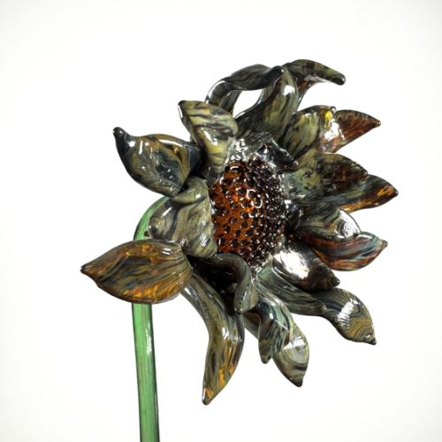 La symbolique florale, me permet de choisir une valeur à cultiver que je transmets ensuite à la fleur cristallisée. J’ai un attrait particulier pour la sculpture du verre à chaud, du à sa spontanéité. En collaboration avec Mathis Magni, nous développons des design mêlant acier et verre, que ce soit des pièces moulées ou cloisonnées.